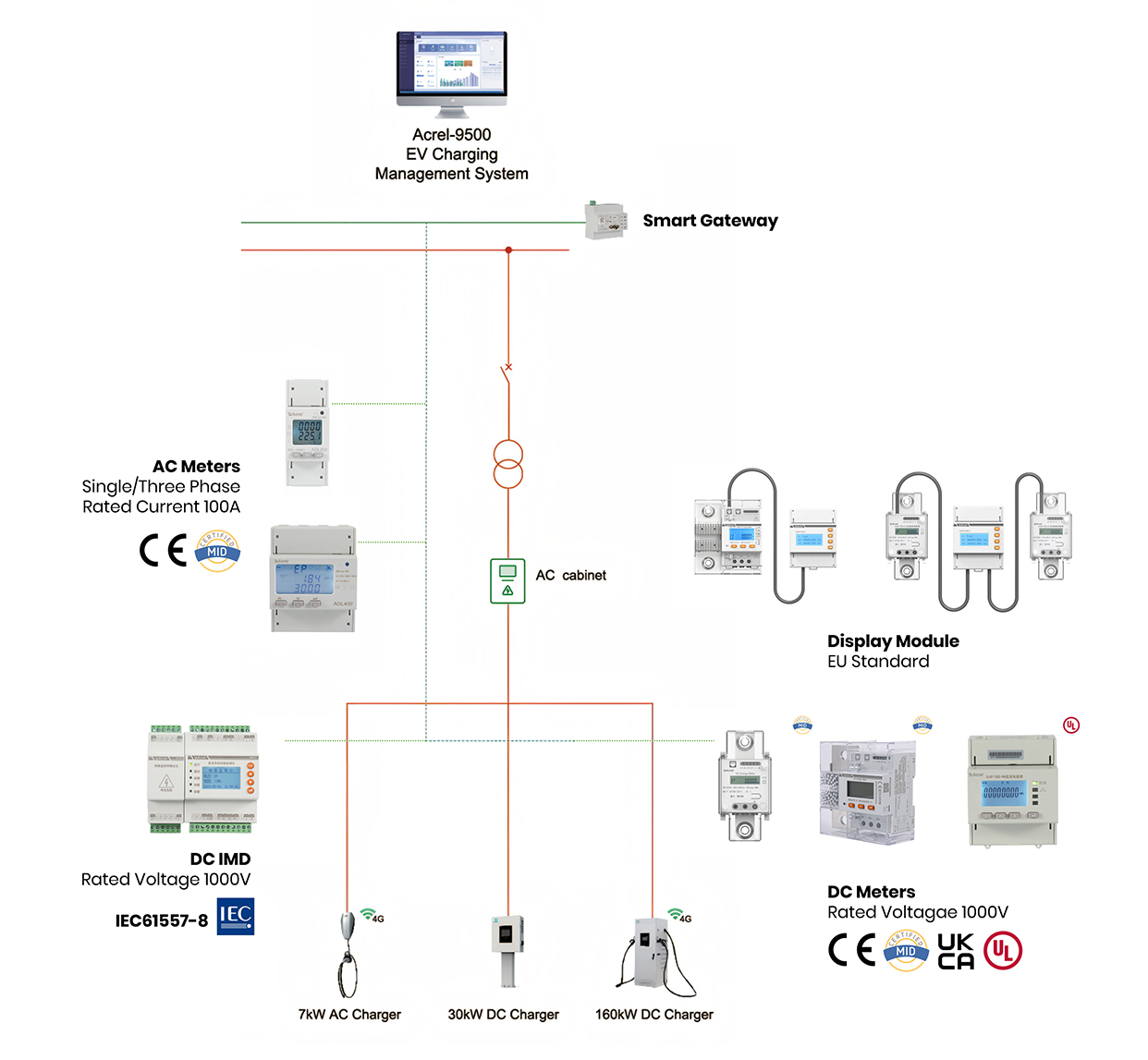 DC-latausskenaarioissa Acrel tarjoaa DJSF1352-sarjan DC-mittareita, jotka eivät vain tue korkeiden virtojen suoraa liitäntää aina 600 A asti, vaan niillä on myös MID- ja UL-sertifikaatit, mikä takaa energian mittauksen tarkkuuden ja turvallisuuden.