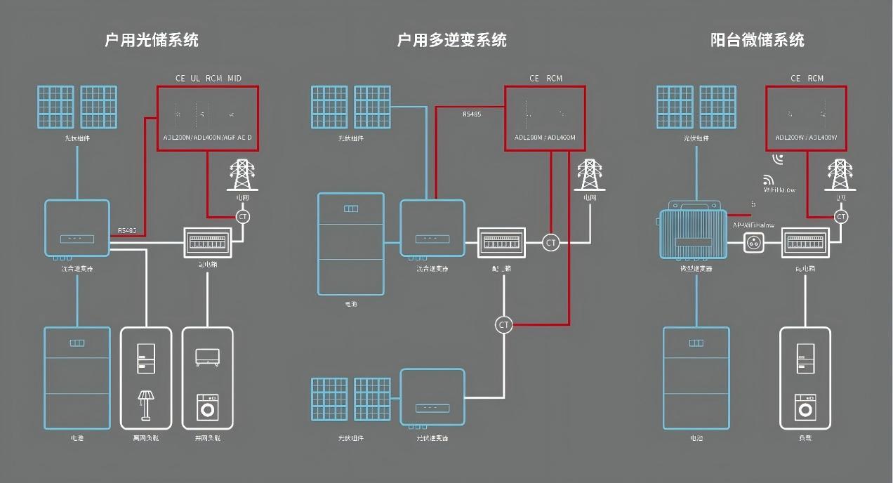 Moniinvertteri kotitalousjärjestelmä: Perussähkö-/tallennusjärjestelmässä on jälkiasennettava ylimääräinen aurinkosähkö/tallennusjärjestelmä moniinvertterikokoonpanon luomiseksi. ADL-mittarit ovat vuorovaikutuksessa päähybridiinvertterin kanssa tarkkailemalla alkuperäistä PV-tuotantoa ja verkkoliitäntäpisteen virtaa takaisinvirtauksen eston valvontatoiminnon saavuttamiseksi.