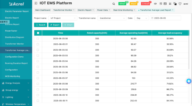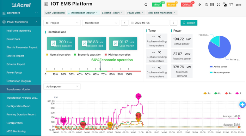 2. Muuntajan toiminnan visualisointi: Alusta valvoo jatkuvasti kriittisiä parametreja (virta, jännite, tehokerroin jne.) varmistaen muuntajien toiminnan turvallisissa kuormitusrajoissa ja vähentäen ylikuormituksen ja vaurioiden riskiä.